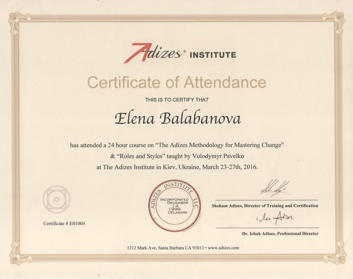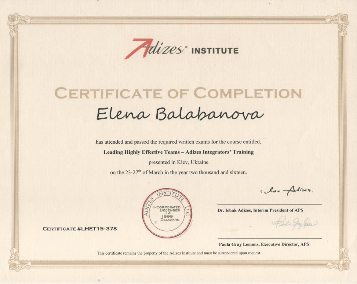 - Leading Highly Effective Teams – Adizes Integrators' Trainin (USA) 2016 г.