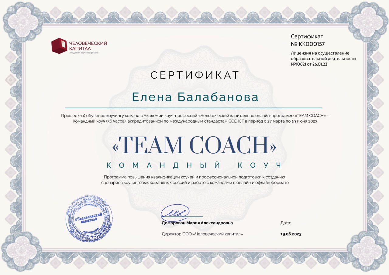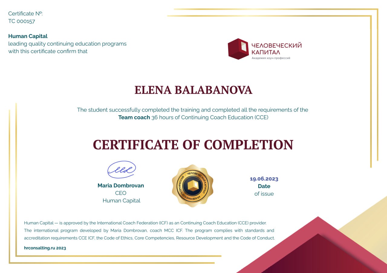 - Team Coaching, CCE ICF Академия «Человеческий капитал» 2023 г.