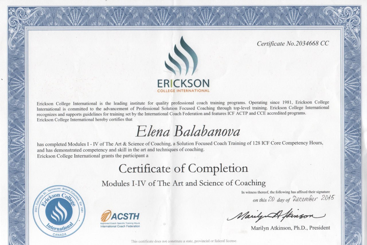 - Erickson International Coaching University (Vancouver, Canada), ACSTH 2015 г.